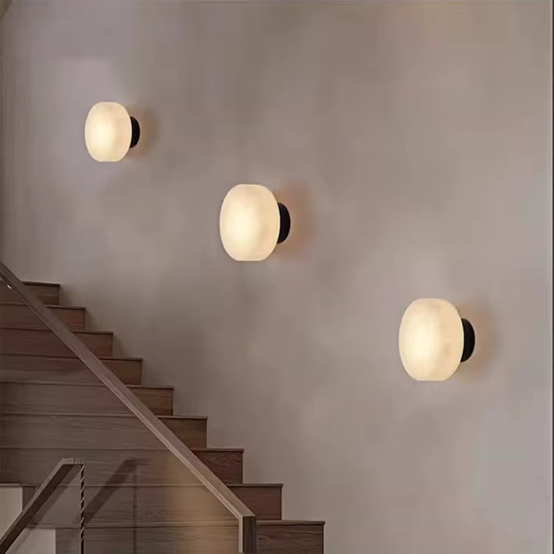 Para um hall de entrada elegante, use duas arandelas de mármore alinhadas na parede principal, na altura aproximada dos olhos, criando um corredor de luz quente de boas-vindas. Em quartos, instale uma peça de cada lado da cama, substituindo abajures e liberando espaço no criado-mudo. Se o ambiente tiver muitos tons claros, a base preta cria contraste moderno; em projetos com metais dourados ou champagne, a versão dourada deixa tudo mais sofisticado e harmonizado.