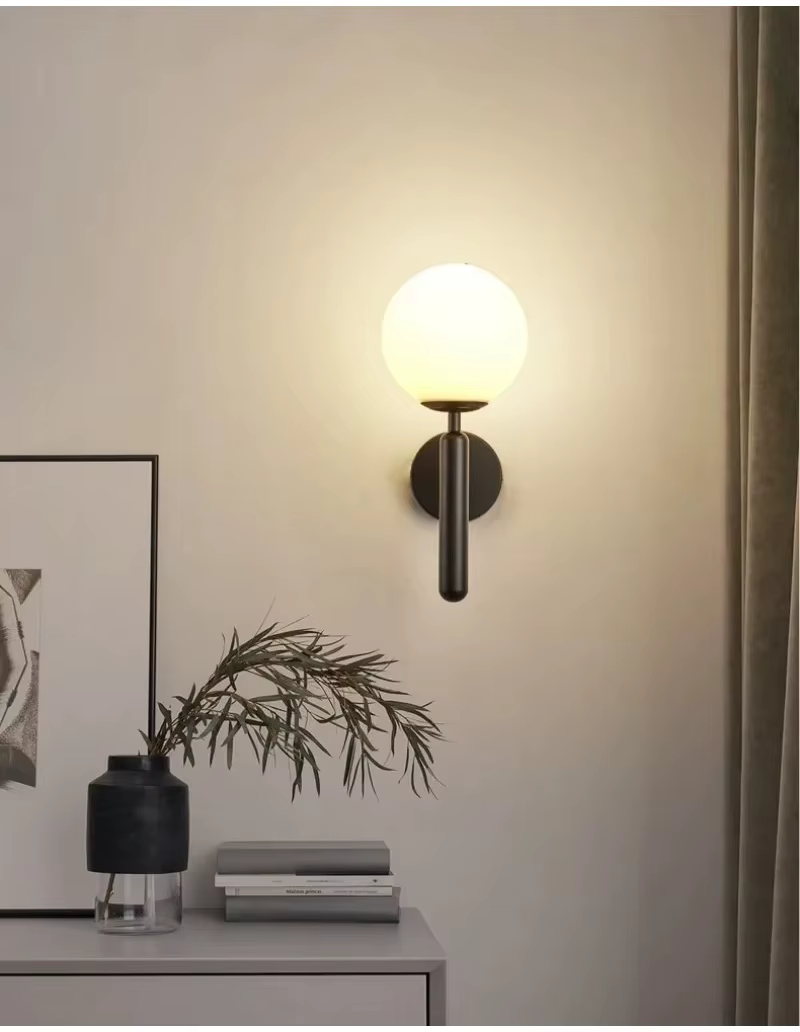 O desenho é simples e marcante: base redonda de 10 cm, haste vertical alongada e um globo de vidro de 15 cm que parece flutuar na ponta. A altura total é de cerca de 35 cm, com projeção aproximada de 20 cm da parede. Na versão preta, a peça cria contraste moderno, perfeito para paredes claras, cimento queimado e projetos minimalistas. Já a versão dourada conversa com metais em tons brass/champagne, trazendo um ar de hotel boutique. O vidro branco fosco difunde a luz, evitando ofuscamento e garantindo um brilho suave.