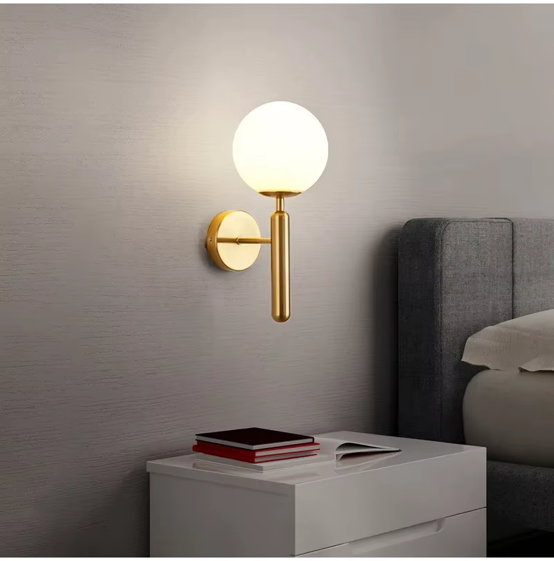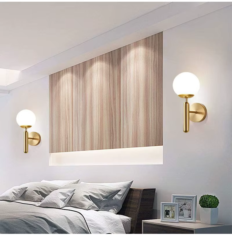 Use a Arandela Globo E27 em par, uma de cada lado da cama ou de um espelho vertical. Para quartos e salas, escolha lâmpadas LED de luz quente (2700K–3000K) e combine a versão dourada com outros detalhes em metal, criando um clima de suíte de hotel. Em projetos mais minimalistas ou com marcenaria preta, a versão preta deixa o ambiente sofisticado e contemporâneo, especialmente quando instalada sobre paredes claras ou texturizadas.