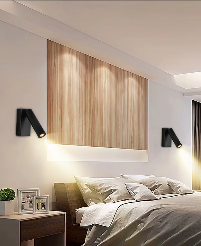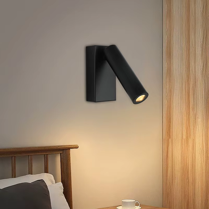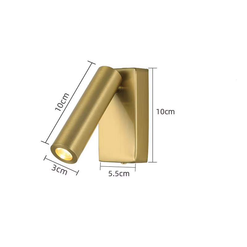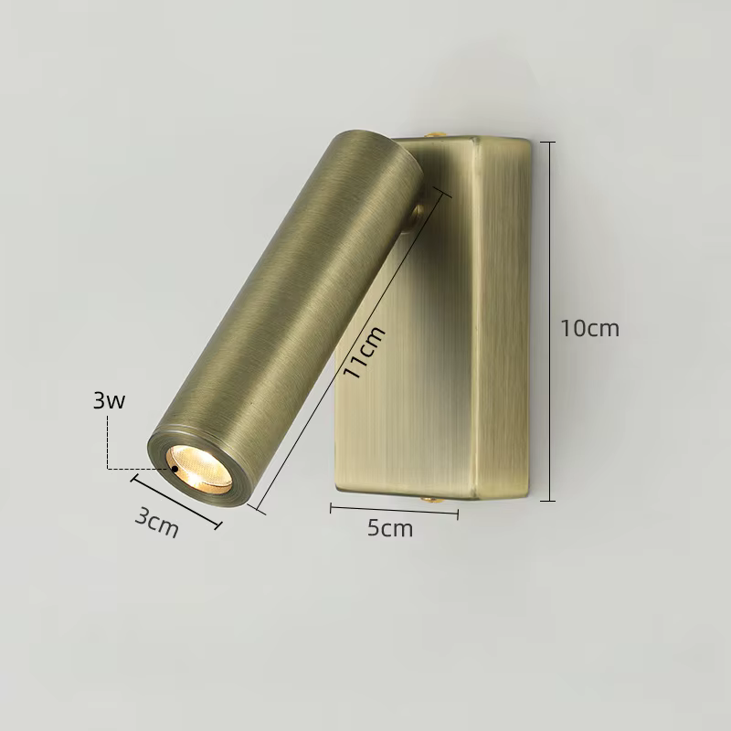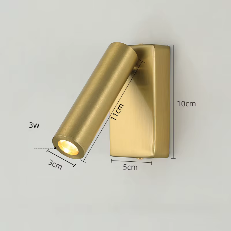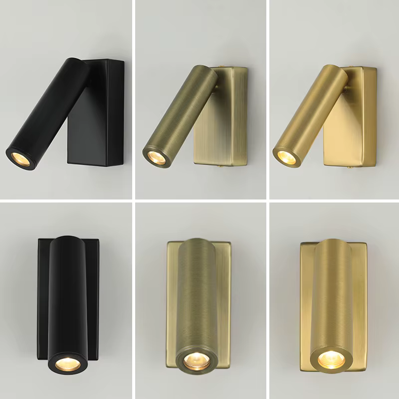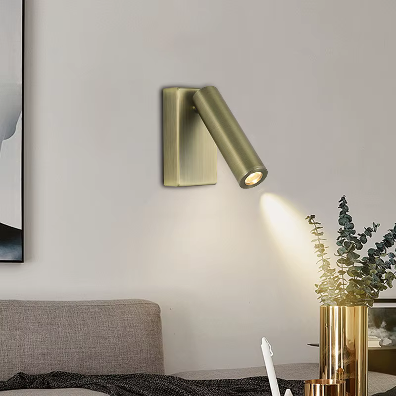 Com corpo em ferro + alumínio, esta arandela tipo spot tem visual limpo e contemporâneo: base retangular compacta e cilindro fino que abriga o LED. As opções de cor – preto, bronze e dourado (brass) – permitem combinar com diferentes acabamentos de ferragens, cabeceiras, mesas laterais e marcenaria. Ela some quando está apagada e ganha protagonismo quando o feixe de luz acende.