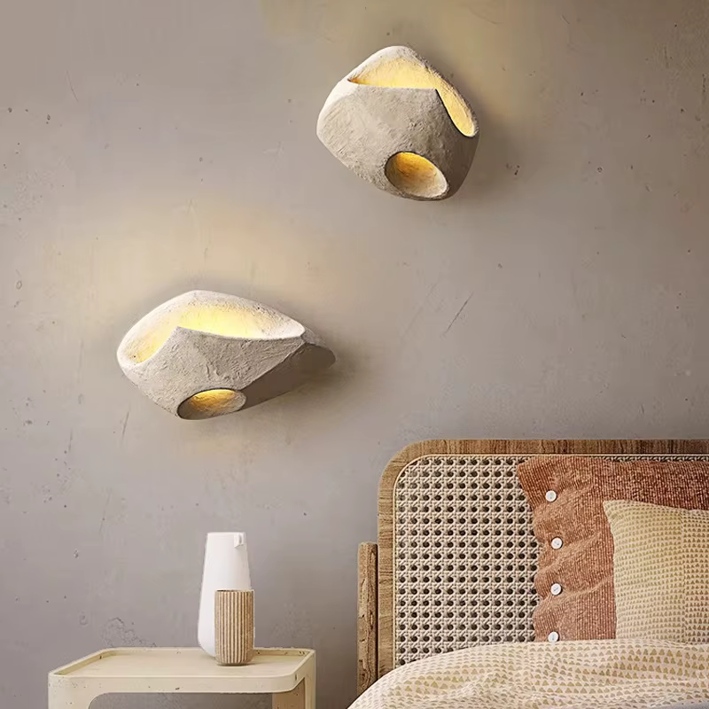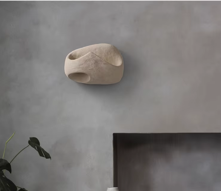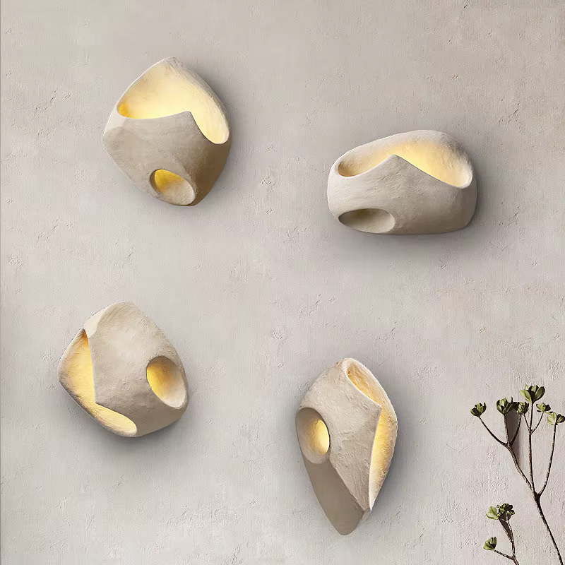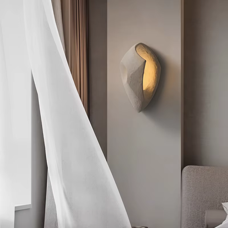 Produzida em microcimento, a arandela assume aparência de rocha esculpida à mão. Durante a secagem natural do cimento, podem surgir pequenas bolhas, poros aparentes, marquinhas de forma e discretos pontos de descascamento. Tudo isso faz parte do processo e é considerado característica do material, não defeito. Essas irregularidades realçam a textura rústica, reforçam o aspecto natural da peça e deixam cada luminária única, com muito mais personalidade na parede.