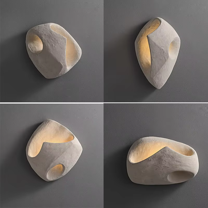 A linha conta com quatro modelos (A, B, C e D), em proporções e recortes diferentes. Todos têm aberturas suaves por onde a luz quente se espalha, criando um jogo de sombra e brilho que valoriza a textura do microcimento. Você pode usar apenas um modelo como ponto de destaque ou combinar vários formatos na mesma parede, compondo um painel artístico com clima de galeria.