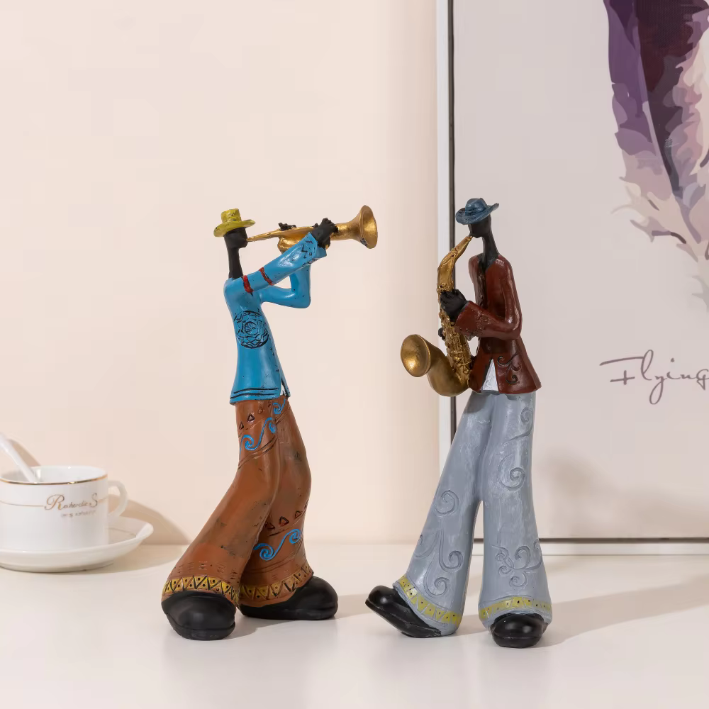 Produzida em resina decorativa de alta qualidade, a Estatueta Banda Jazz apresenta ótimo nível de detalhe em roupas, instrumentos e postura dos músicos. A textura suave e o acabamento cuidadoso garantem uma presença visual refinada, que combina tanto com móveis de linhas retas quanto com peças mais clássicas. Por ser um objeto totalmente decorativo, não precisa de pilhas, energia ou manutenção: basta posicionar e aproveitar o efeito visual.