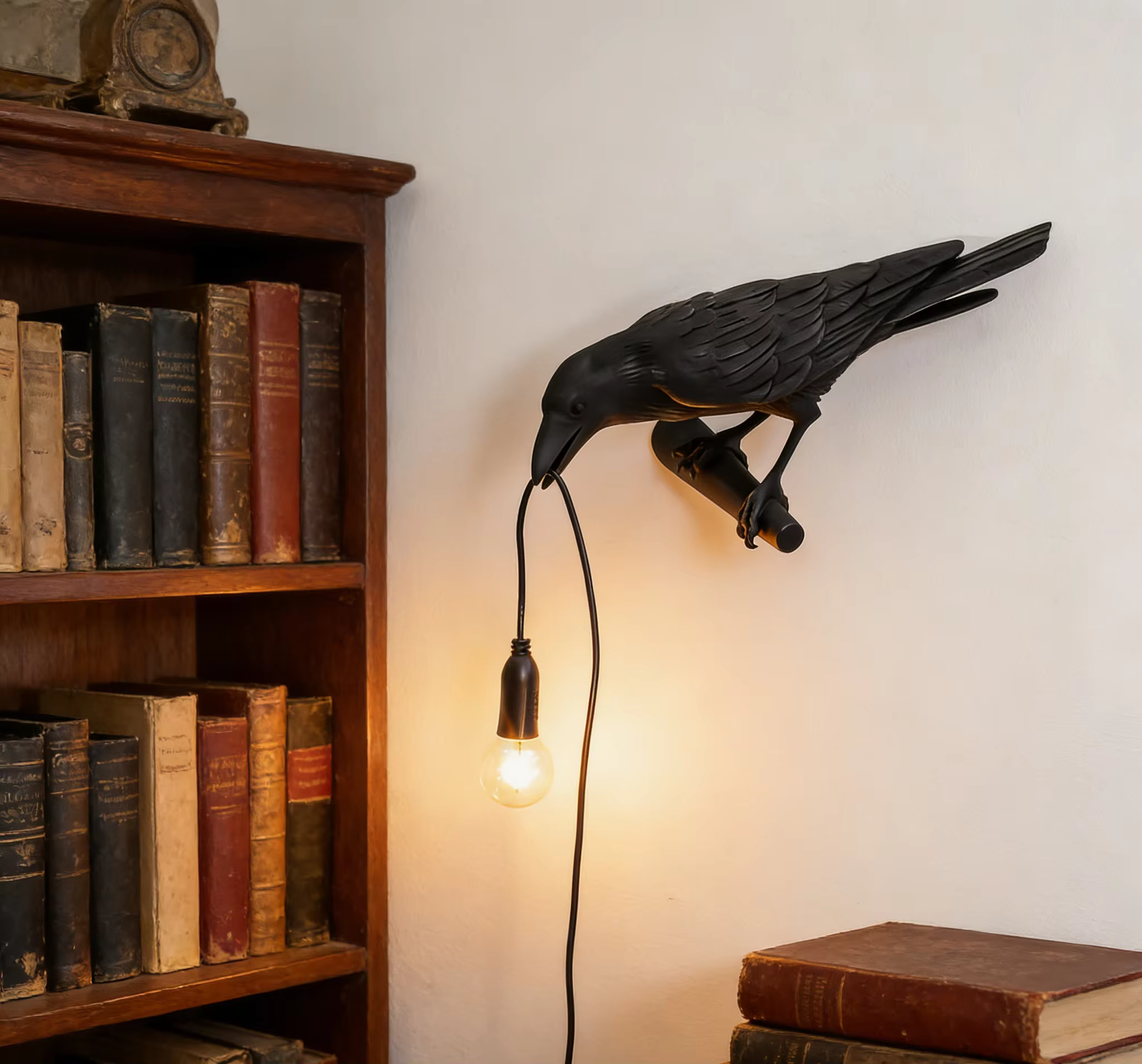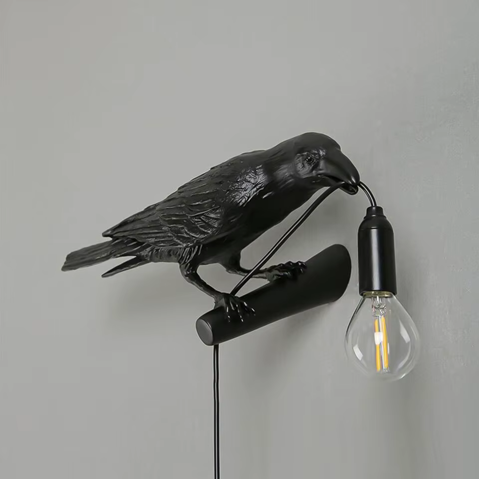 Use a versão preta em paredes claras para criar contraste e deixar o corvo em destaque. Em quartos e cantinhos de leitura, a peça fica linda ao lado da cama ou sobre uma mesa lateral, criando uma luz de apoio com personalidade. Para um efeito ainda mais artístico, combine com livros, plantas pendentes e objetos em madeira ou metal escuro.